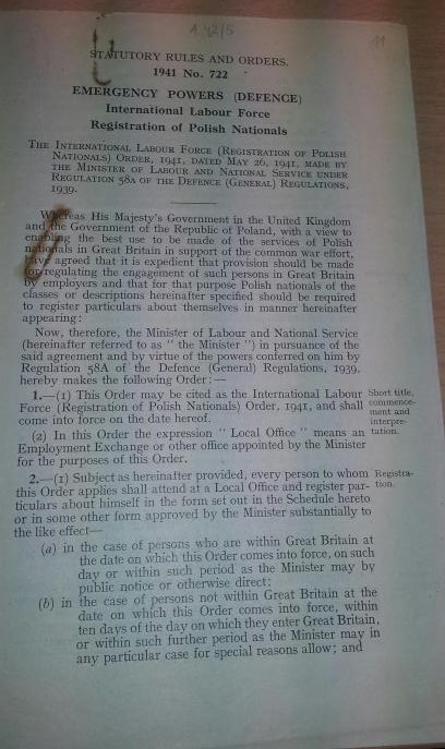 I have also come across a leaflet printed by the Emergency Powers (Defence) aimed at the International Labour Force in 1941 ordering Polish immigrants to register in order to fight for Britain during the WWII struggle.
